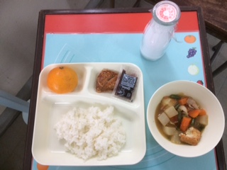 今日の献立は、まぐろのフライ、豚肉とあつあげの煮もの、みかん でした。