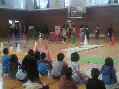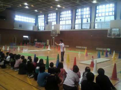 いつもは運動場に交差点を書いて練習するのですが、天気の関係で今年は講堂で行いました。