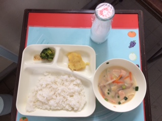 18日の給食は、かす汁、ブロッコリーのごまあえ、くりきんとん でした。(写真上)