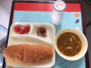 19日の給食は、豚肉のしょうゆマヨネーズ焼き、カレースープ、プチトマト でした。(写真下)