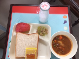 今日の献立は、ビーフシチュー、ツナとキャベツのソテー、りんご でした。パンにはアプリコットジャムがついていました。