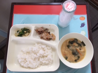 今日の献立は、豚肉のごまだれ焼き、みそ汁、きくなとはくさいのおひたし でした。
