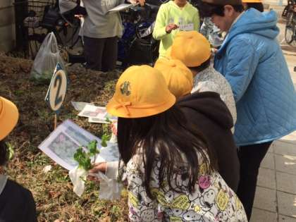 校庭や校舎裏の木や草の様子を観察したり、クイズに答えたりしながら、春を前にした草木の様子を学習しました。