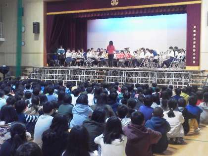 インフルエンザの影響で日程を再調整したクラブ発表を今日の朝会の時間に行いました。今日は、金管バンドクラブの発表でした。