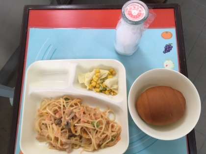 今日の献立は、さけのクリームスパゲティ、キャベツとコーンのサラダ でした。
