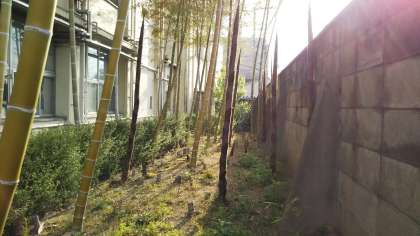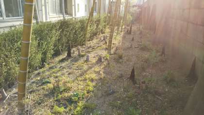 正門脇の竹林、4月から「たけのこ」が顔を出し始め(上の写真)、わずか1週間ほどでみるみる大きくなりました(下の写真)。