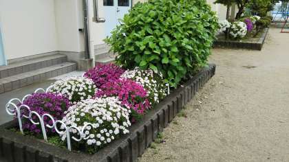 しばらく汗ばむくらいの陽気が続いていましたが、今日は久しぶりの雨となりました。運動場で遊べないので、子どもたちにとってはあまり歓迎されない雨ですが、校内に咲く花々にとっては恵みの雨。緑の鮮やかさと花の色が見事なコントラストを描いていました。