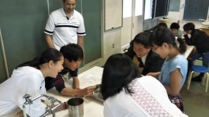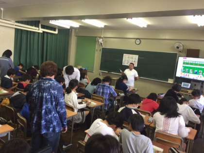 中学校の教室では、小学校の先生が主となり、中学校の先生がティームティーチングという形で子どもたちの指導にあたります。今日は英語の授業や理科の実験など、1教室に3〜4名の先生が子どもたちの指導に入り、質問に答えたり、アドバイスをしたりしました。50分というやや長めの授業でしたが、集中して学習に取り組むことができていました。