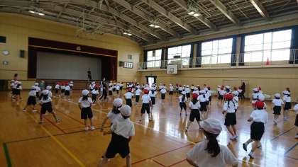 1年生と2年生が一緒にダンスの練習をしました。元気よく、手を伸ばしたり、リズムよくジャンプをしたり、音楽に合わせて踊っています。