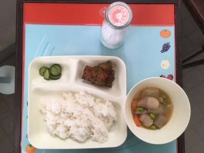 今日の献立は、ちくわのいそべあげ、鶏肉とさといもの煮もの、あっさりきゅうり、ご飯、牛乳です。
