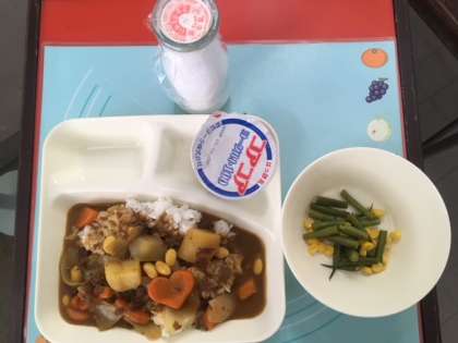 今日の献立は、牛肉と大豆のカレーライス、三度豆とコーンのサラダ、ヨーグルト です。
