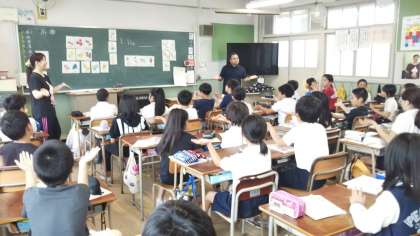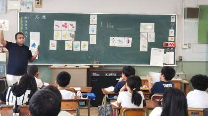 果物やスポーツの絵カードを使い、みんなで「I like ○○」の発表をしました。最後は、隣の人と簡単なゲームをして、楽しく「I like〜」の使い方を学ぶことができました。
