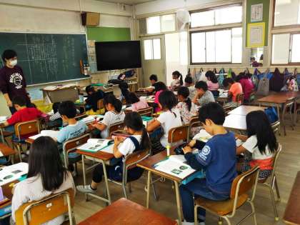 3年生2学級を3つのコースに分けて、3人の先生がそれぞれのグループを指導します。授業の進度はどのコースも同じですが、いつもの授業より各教室の人数が少ない分、子どもたちも質問したり発言したりしやすい利点があります。