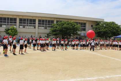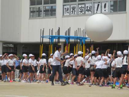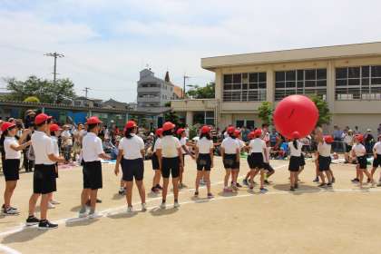 大玉ころがしと大玉はこびをミックスさせた競技で、全学年で協力して行います。