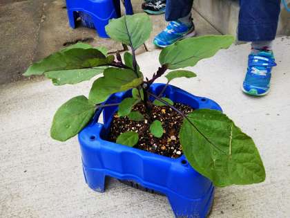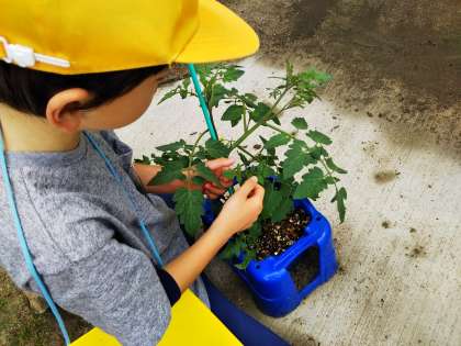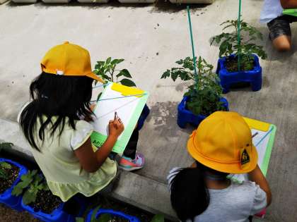 1年生はあさがおを育てていますが、2年生は野菜の苗を育てています。ピーマン、ミニトマト、おくら、なすなどを各自が植木鉢で育てています。この1週間ほどで、グンとたくましく成長してきました。今日は大きくなった苗の観察をしました。