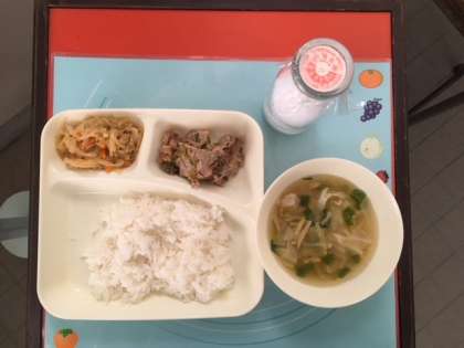 今日の献立は、豚肉の梅風味焼き、すまし汁、切り干しだいこんのいため煮、ご飯、牛乳 です。