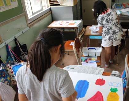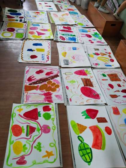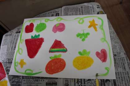 絵の具の基本的な使い方や片づけ方を学んだあと、今日はパスで描いた絵に絵の具で色つけをしていきました。今まではパスで着色をしていましたが、絵の具での着色は初めてです。どの子もとても楽しそうに絵の具を使って、色とりどりの絵が完成しました!