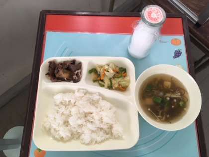 今日の献立は、牛肉のおろしじょうゆかけ、もずくとオクラのとろり汁、野菜のそぼろいため、ご飯、牛乳 です。