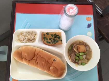 今日の献立は、豚肉と野菜の煮もの、チヂミ、もやしの甘酢あえ、おさつパン、牛乳 です。