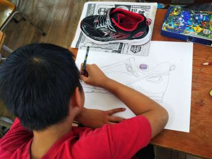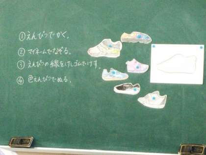 机の上に自分のくつを置いて、じっくりと見ながら鉛筆でデッサンしていきます。そのあと、ペンでなぞり、色鉛筆で色をつけていきます。