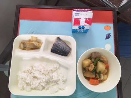 今日の献立は、さごしの塩焼き、じゃがいもと一口がんもの煮もの、キャベツのおひたし、ご飯、牛乳 です。