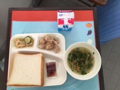 今日の献立は、鶏肉のからあげ、とうがんの中華スープ、切り干しだいこんの辛みづけ、食パン、いちごジャム、牛乳 です。
