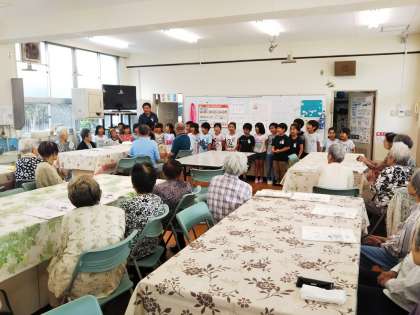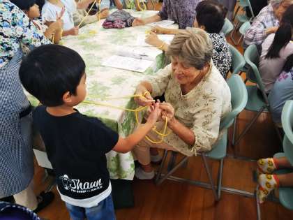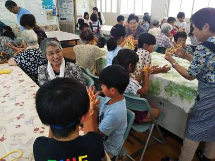 食事のあと、子どもたちと交流することも楽しみにされており、今日は1年1組の子どもたちが家庭科室に来て、朗読や「きらきら星」の歌を披露してくれました。また、あやとりをしたりストローを使ったゲームをしたりして地域の方との交流を深めました。子どもたちも地域の方々も優しそうな笑顔、笑顔…。とても素敵な光景でした!