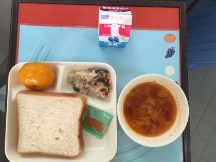 今日の献立は、豆乳マカロニグラタン[米粉」、トマトスープ、みかん(冷)、食パン、りんごジャム、牛乳 です。