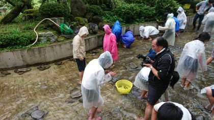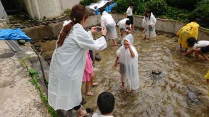 焼き板みがきをしている裏で、もういっぽうのクラスは、魚つかみを楽しんでいます。宿の敷地の一角に人工の川が作り出され、わいわいとチャレンジ。うまくつかまえられたかな?