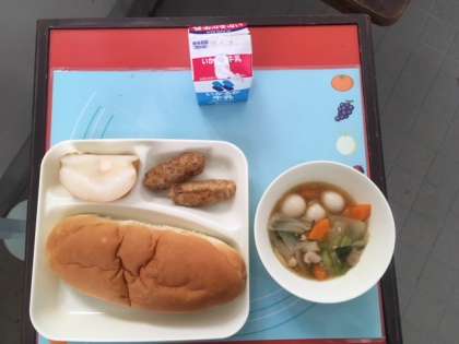 今日の献立は、あげギョーザ、中華煮、なし(豊水)、おさつパン、牛乳 です。