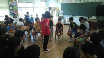 クラスを2つのグループに分けて輪をつくります。1人の子が輪の中に入り、周りの子どもたちがその子の良いところを次々に発表していきます。みんな少しはにかみながらも、その子の良いところを次々と発表していきます。その子は20人近くの子どもたちから、自分の良いところの「ことばのシャワー」をあびることになります。なんともうれしそうな、恥ずかしそうな表情がとても印象的でした。クラス全員が、この素敵な「シャワー」をあび、優しそうな笑顔が教室にあふれました!