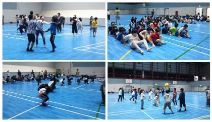 宿舎はサッカー合宿や企業研修などにも使われる総合宿泊施設となっており、大きな体育館を備えています。6年の担任考案のレクリエーションも飛び出し、めいっぱい体を動かしたようです。