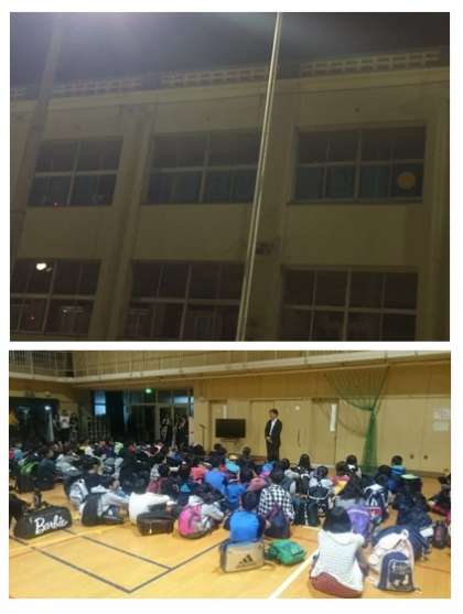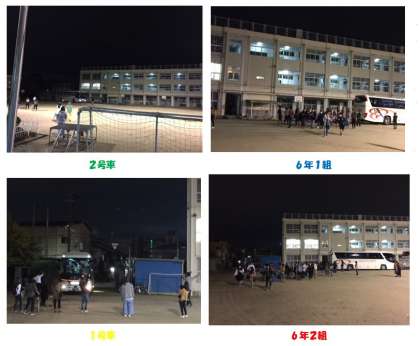 保護者の方やきょうだい、教職員が待つ運動場にライトをつけたバスが帰ってきました。1泊2日ですが懐かしい感じ。互いに手を振り合い、笑顔が広がりました。