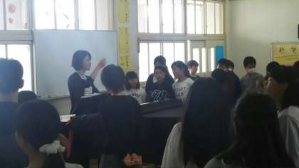 そんな中、今日は淡路中学校から音楽の先生に来ていただき、特別授業をしていただきました。発声法やリズムのとり方など、普段の雰囲気とは少し違った学習に、「中学校の授業」を少し体感した6年生でした。