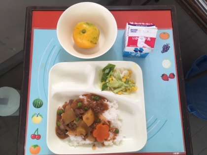 今日の献立は、ハヤシライス[米粉]、キャベツとコーンのサラダ、みかん、牛乳 です。