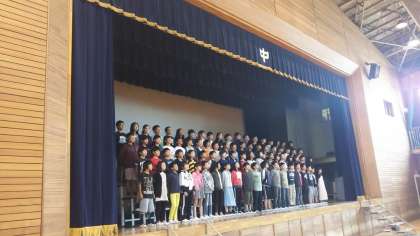 小学校より一回り大きい体育館の舞台に立つ子どもたち。体育館には子どもたちと小学校の先生以外、誰もいませんでしたが、ほどよい緊張感の中「Can Do」と「いのちのうた」の2曲を練習しました。
