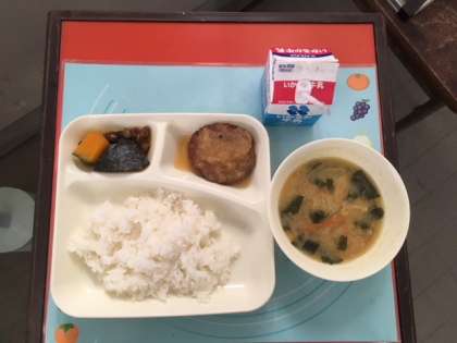 今日の献立は、和風おろしハンバーグ、みそ汁、かぼちゃのいとこ煮、ご飯、牛乳 です。