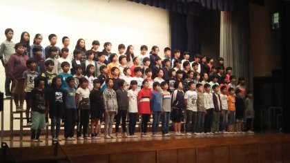 ほどよい緊張感の中、舞台で大きな声で美しく歌い上げる6年生。間奏の間に、呼びかけの言葉も入れながら2曲を歌い上げました。小学生らしい一生懸命さが伝わってくる発表で、歌い終わると会場から大きな拍手が起こりました。とても立派でした!