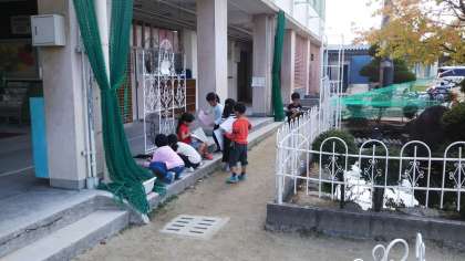 5時間目に1年生がノート片手に池の周りや花壇で何かを探している様子。
