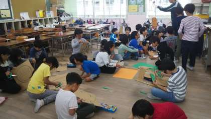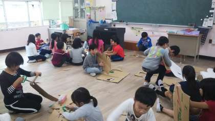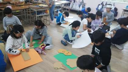 学習発表会に向けて、各学年、講堂での練習が多くなってきていますが、3年生は今日、学習発表会で使う小道具づくりをしました。