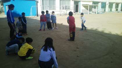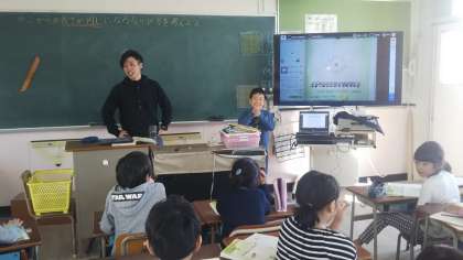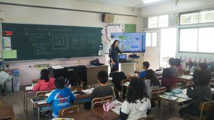 各自が書いた考え(図)を教室の大型ディスプレイに映して意見を交流したり、実際に運動場に出て、運動会の時に使う円を描く道具を使ってイメージを持たせたりと、アプローチの仕方はさまざまですが、「まるい形」の特性についてしっかりと考えることができました。