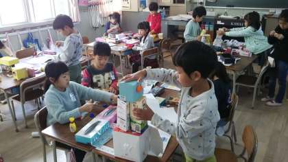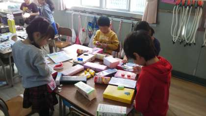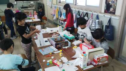 1年生は算数の学習で、お家から色々な空き容器を持ってきて形の学習で使いましたが、今日はそれらを使って生き物や乗り物、建物など、1人1人が思い思いのものを作ってみました。