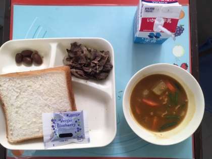 今日の献立は、牛肉の香味焼き、豚肉とだいこんのカレー煮、うずら豆のグラッセ、食パン、ブルーベリージャム、牛乳 です。