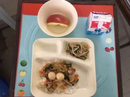 今日の献立は、中華丼、もやしの中華あえ、りんご、牛乳 です。