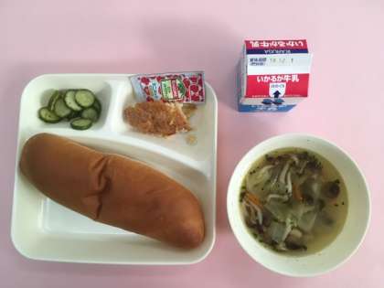 今日の献立は、ツナポテトオムレツ、スープ、きゅうりのバジル風味サラダ、黒糖パン、牛乳 です。