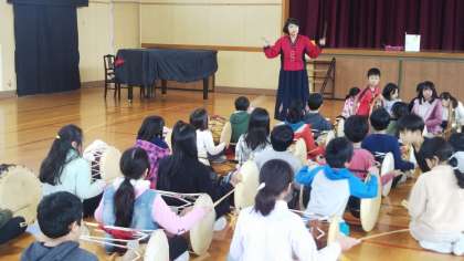 今日は4年生で、多文化教育の一環としてソンセンニムに来ていただき、韓国・朝鮮の楽器にふれる授業が行われました。