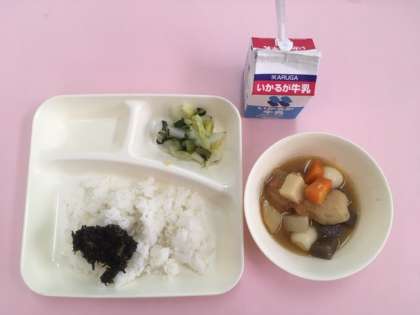 今日の献立は、関東煮、こまつなとはくさいの甘酢あえ、のりのつくだ煮、ご飯、牛乳 です。
