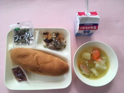 今日の献立は、鶏肉とじゃがいものスープ煮、きのこのドリア、ミニフィッシュ、大型コッペパン、いちごジャム、牛乳 です。