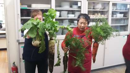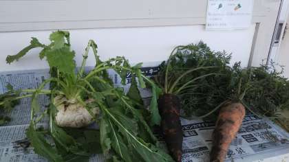 だいこんやにんじん、かぶらにキャベツなど、どの野菜も青々としていてとても美味しそう!だいこんやにんじんは葉っぱもついたものをいただき、実も丸々としてとても立派なものです。