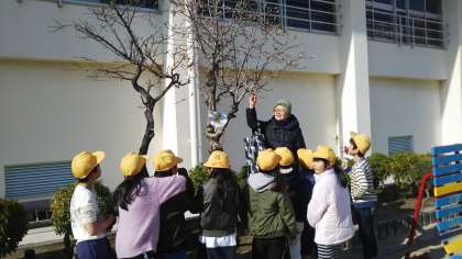 今日はシニア自然大学校の皆様にお越しいただき、4年生に自然観察会の授業をしていただきました。